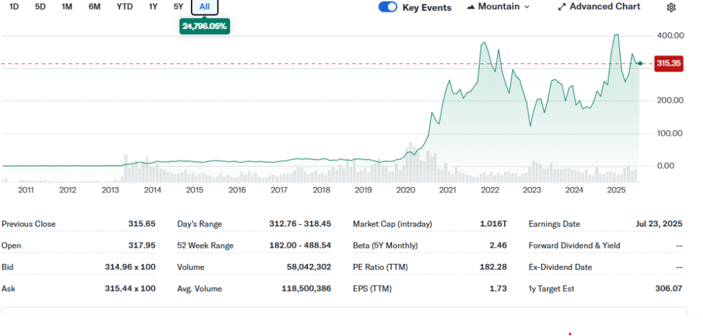 • 2025년 7월 현재 주가: $315.35(약 43만원), 연초 대비 16.9% 하락.